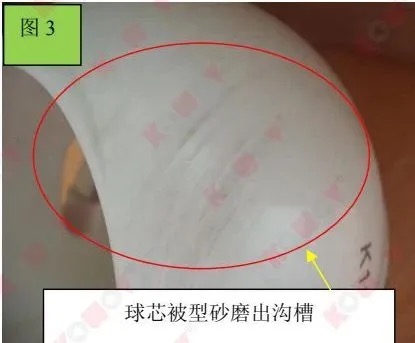 2、球芯与阀座密封面部分都被磨出细长沟槽;