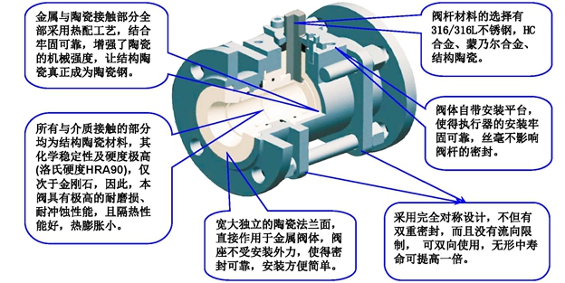 二、结构方面,KOWOV陶瓷球阀利用加拿大的技术采用了目前世界上最合理的三片式完全对称的结构,不但有双重密封,而且没有流向限制,可以任意方向或位置使用。无形中寿命可提高一倍;阀门的法兰与阀座为分体式结构,保证了球芯不直接受力,即使法兰面受力严重时也不会产生球芯抱死,阀门开不动关不掉的故障;阀座后独有的弹性补偿设计,可以保证在任何时候都有良好的密封性,并且在介质中有杂质时不容易卡堵,或造成球的碎裂;宽大独立的陶瓷法兰密封面(≥法兰密封面的三分之二),直接作用于金属阀体,阀座不受安装外力,使得密封可靠,安装方便简单!